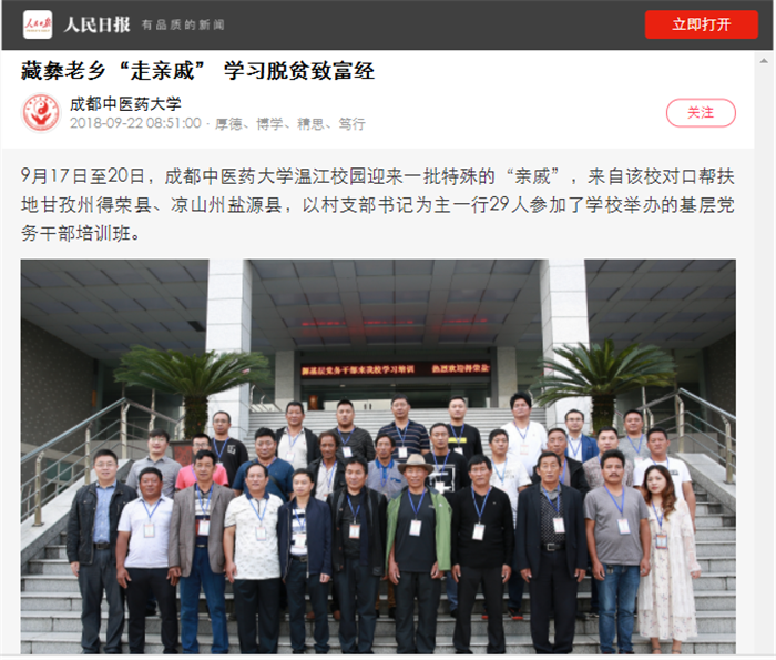9月17日至20日,成都中医药大学温江校园迎来一批特殊的“亲戚”,来自该校对口帮扶地甘孜州得荣县、凉山州盐源县,以村支部书记为主一行29人参加了学校举办的基层党务干部培训班。
