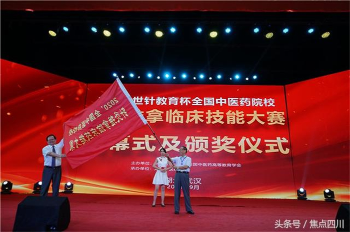 大赛最后举行了赛旗交接仪式,由世界针灸学会联合会副主席、针灸推拿学科带头人梁繁荣教授接过赛旗,2020年全国中医药院校针灸推拿临床技能大赛将由四川成都中医药大学承办。