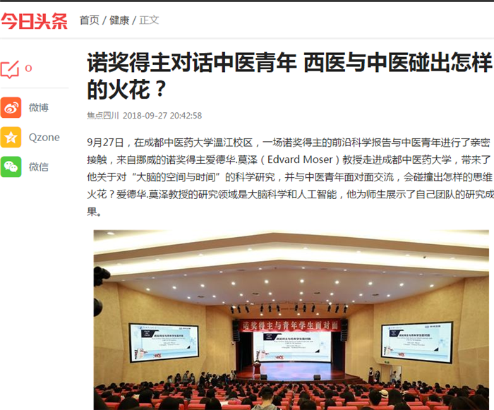 9月27日,在成都中医药大学温江校区,一场诺奖得主的前沿科学报告与中医青年进行了亲密接触,来自挪威的诺奖得主爱德华.莫泽(Edvard Moser)教授走进成都中医药大学,带来了他关于对“大脑的空间与时间”的科学研究,并与中医青年面对面交流,会碰撞出怎样的思维火花?爱德华.莫泽教授的研究领域是大脑科学和人工智能,他为师生展示了自己团队的研究成果。
