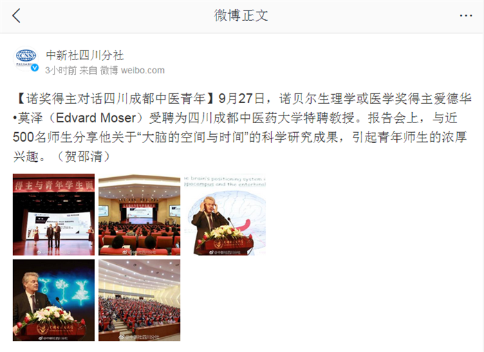 【诺奖得主对话四川成都中医青年】9月27日,诺贝尔生理学或医学奖得主爱德华•莫泽(Edvard Moser)受聘为四川成都中医药大学特聘教授。报告会上,与近500名师生分享他关于“大脑的空间与时间”的科学研究成果,引起青年师生的浓厚兴趣。