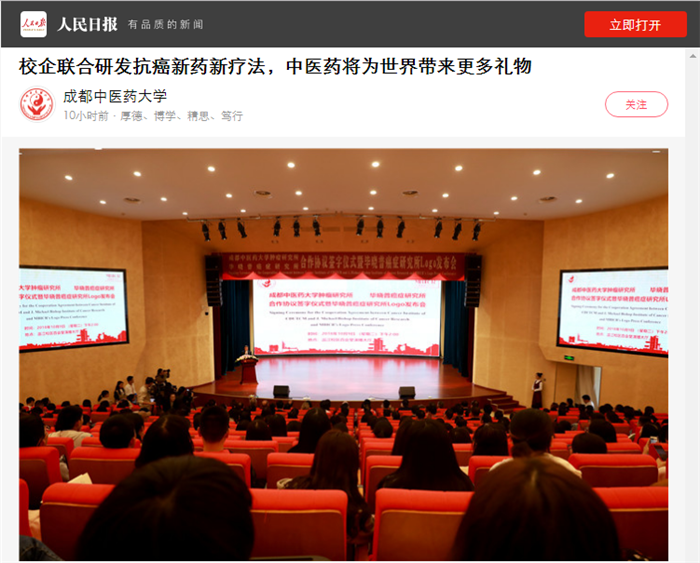 根据校企合作框架协议,成都中医药大学肿瘤研究与毕晓普癌症研究所结成战略伙伴,将以共建实验室,科研项目申报及成果共享,人才培养作等形式开展深度合作,共同攻克世界医学难题。