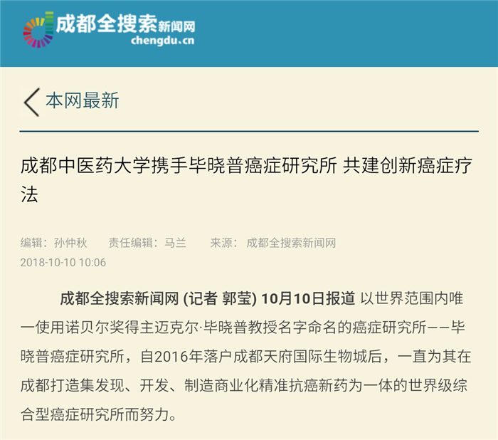 成都中医药大学携手毕晓普癌症研究所 共建创新癌症疗法