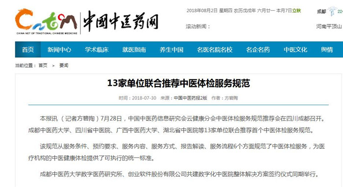本报讯 (记者方碧陶)7月28日,中国中医药信息研究会云健康分会中医体检服务规范推荐会在四川成都召开。成都中医药大学、四川省中医院、广西中医药大学、湖北省中医院等13家单位联合推荐首个中医体检服务规范。