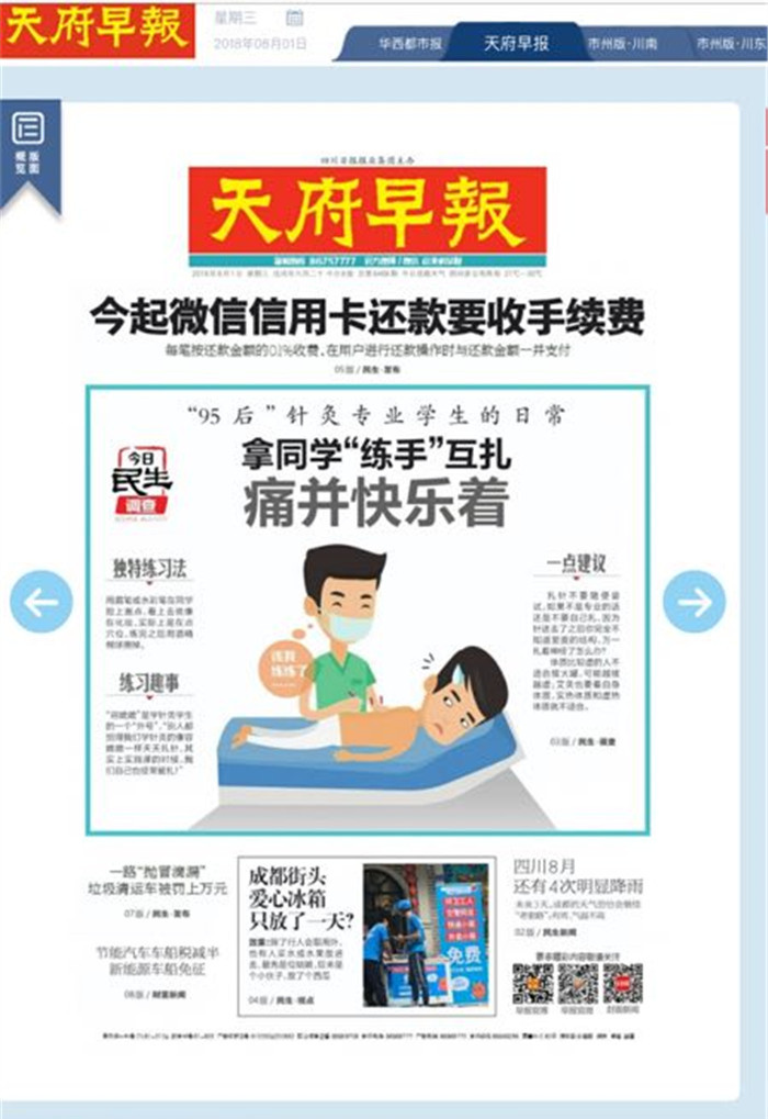 7月28日,天府早报记者来到成都中医药大学十二桥校区,采访到了针灸推拿学院2014级吴棹仙班的“95后”妹子金银。虽然已经放暑假了,但下学期即将“大五”的金银,在这个暑假开始了自己为期一年的实习生活,她告诉记者,目前她在四川省人民医院实习。“我们是七年学制,大二开始正式学习针灸推拿专业相关的课程。有两种课程,一种是理论课,主要是认准穴位、经络。另一种是实验课,学习如何进针、扎针。”