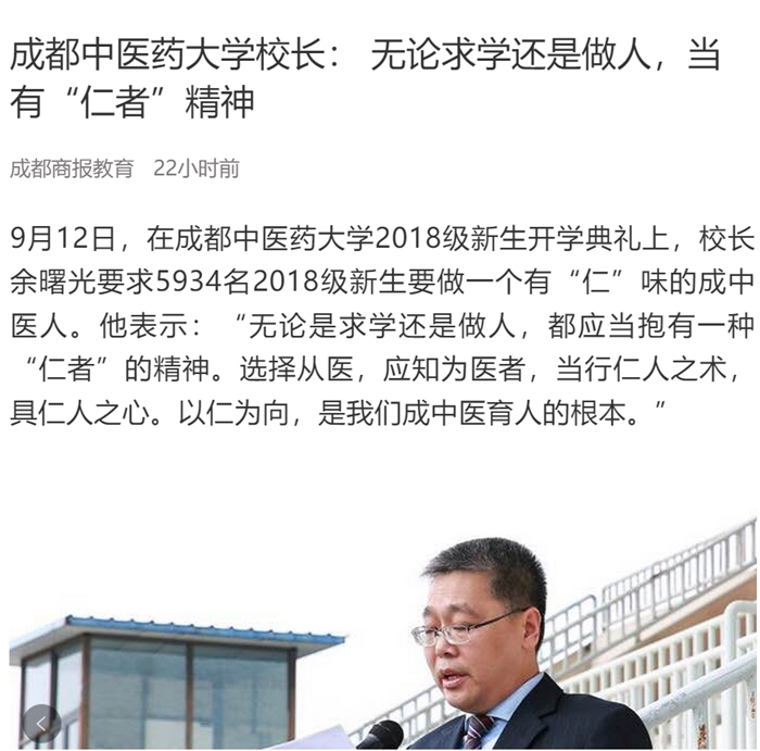 9月12日,在成都中医药大学2018级新生开学典礼上,校长余曙光要求5934名2018级新生要做一个有“仁”味的成中医人。他表示:“无论是求学还是做人,都应当抱有一种 “仁者”的精神。选择从医,应知为医者,当行仁人之术,具仁人之心。以仁为向,是我们成中医育人的根本。”
