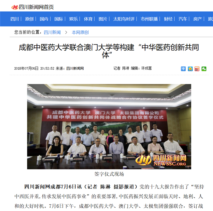 党的十九大报告作出了“坚持中西医并重,传承发展中医药事业”的重要部署,中医药振兴发展正面临天时、地利、人和的大好时机。7月6日下午,成都中医药大学、澳门大学、太极集团强强联合,签订战略合作协议,结成战略合作联盟,三方将构建“中华医药创新共同体”,打造世界顶尖的中华医药创新高地。“中华医药创新共同体”是境内外推进国际化合作创新模式,将实现川渝澳独特资源共享,实现境内外协同创新,推动中医药海内外市场拓展,实现我国传统中医药事业高质量发展。