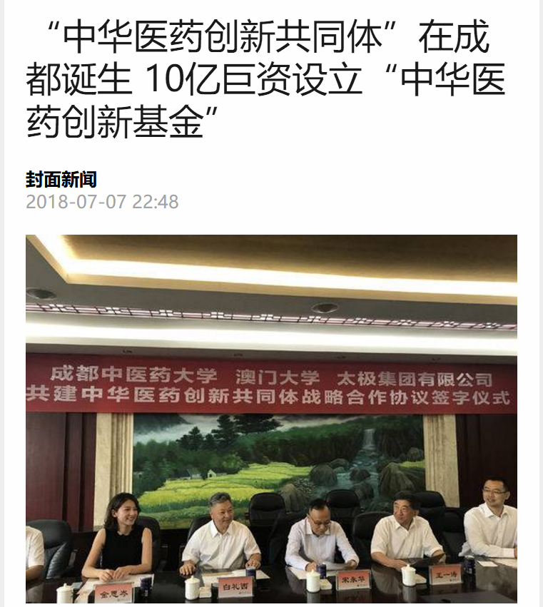 7月6日,成都中医药大学、澳门大学、太极集团联合签订战略合作协议,结成战略合作联盟,三方将构建“中华医药创新共同体”,打造世界顶尖的中华医药创新高地。“中华医药创新共同体”是境内外推进国际化合作创新模式,将实现川渝澳独特资源共享,实现境内外协同创新,推动中医药海内外市场拓展,实现我国传统中医药事业高质量发展。对深入推进全面开放合作,优化调整工业结构和布局,大力发展现代服务业,集聚和用好战略科技创新资源,提升科技成果转化实效,推进西部创新人才高地建设以及全面推进社会民生事业都具有深远意义。