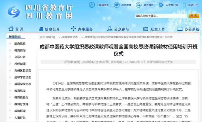 5月14日,全国高校思想政治理论课2018年版教材使用培训班在北京开课,成都中医药大学党委书记刘毅带领马克思主义学院领导班子及思政课专兼职教师20余人,在学校分会场通过视频直播观看了开班仪式。