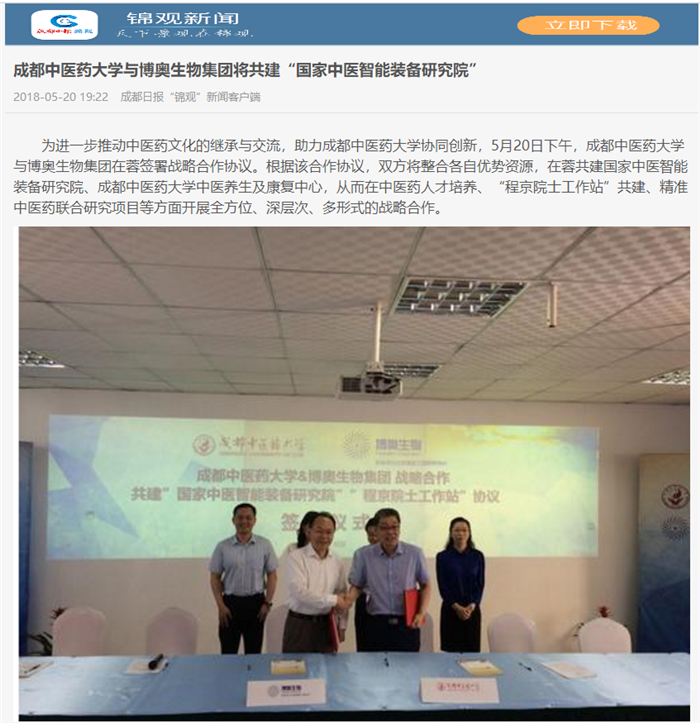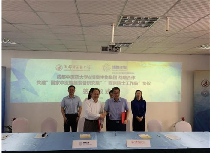为进一步推动中医药文化的继承与交流,助力成都中医药大学协同创新,5月20日下午,成都中医药大学与博奥生物集团在蓉签署战略合作协议。根据该合作协议,双方将整合各自优势资源,在蓉共建国家中医智能装备研究院、成都中医药大学中医养生及康复中心,从而在中医药人才培养、“程京院士工作站”共建、精准中医药联合研究项目等方面开展全方位、深层次、多形式的战略合作。