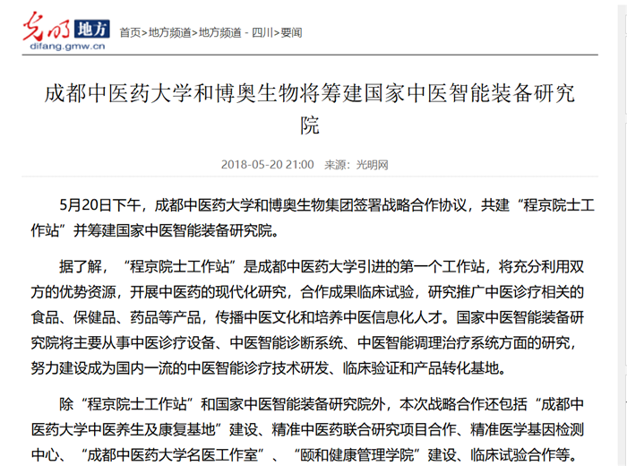 成都中医药大学和博奥生物将筹建国家中医智能装备研究院