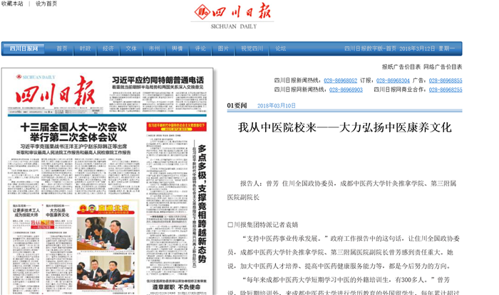“支持中医药事业传承发展。”政府工作报告中的这句话,让住川全国政协委员,成都中医药大学针灸推拿学院、第三附属医院副院长曾芳感到责任重大。她说,加大中医药人才培养、提高中医药健康服务能力等,都是今后努力的方向。