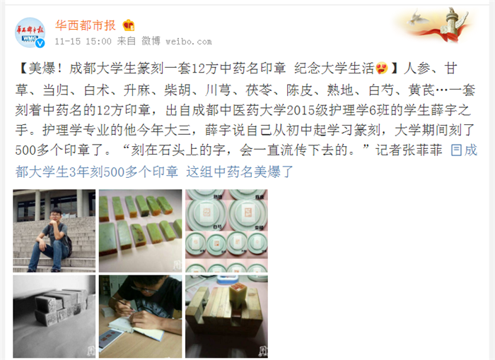 人参、甘草、当归、白术、升麻、柴胡、川芎、茯苓、陈皮、熟地、白芍、黄芪…一套刻着中药名的12方印章,出自成都中医药大学2015级护理学6班的学生薛宇之手。护理学专业的他今年大三,薛宇说自己从初中起学习篆刻,大学期间刻了500多个印章了。“刻在石头上的字,会一直流传下去的。”