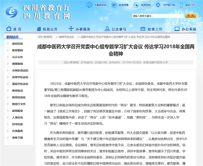 成都中医药大学召开党委中心组专题学习扩大会议 传达学习2018年全国两会精神