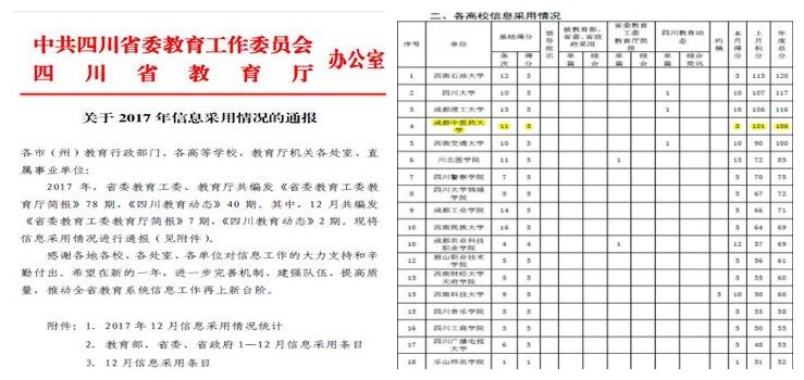 学校2017年度信息报送工作在全省109所高校中排名第四 发布时间:2018-01-05 00:00:00 浏览次数: 次 【字体:小 大】 2017年度,我校高度重视信息报送工作,紧扣学习贯彻党的十九大精神和省委十一届二次全会精神,及时准确反映本校贯彻落实中央、省委省政府决策部署的特色亮点工作、基层实践的创新做法和意见建议等情况,努力提升信息工作整体水平,更好服务全省教育大局。 2017年度,在四川省教育厅《省委教育工委教育厅简报》和《四川教育动态》中总共刊发信息9篇。学校在全省109所高校在109所高校中年度排名第四名,比2016年度提升了两名。 (文、图/党政办公室 编辑/王其奇) 【打印正文】 上一条:《教育导报》:高校对口扶贫妙招迭出—— 送“智”又送“志” 下一条:四川经济网:成都中医药大学举办首届国际生物医药与中医药青年论坛