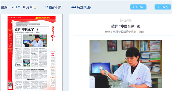 “与西药成分、药效数据明确相比,传统中医药理论比较宏观,一般人听起来觉得玄奥,但这并不影响千百年来广大患者对中医药的信赖。我们捍卫中医的尊严,就是要坚守科学实证的精神。”曾南认为,影响中药药效的作用因素很多。包括产地、采收、贮存、炮制、工艺处理过程等都会影响有效成分的含量高低,她的工作,就是在中医药理论指导下,运用现代科学技术,描述中药或复方的有效性和安全性,为其功能主治提供科学内涵。