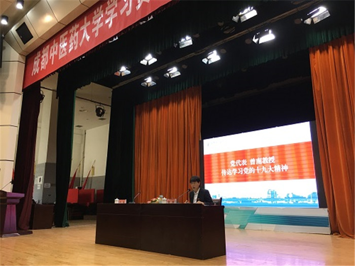 下午,曾南在学校开始了她的宣讲,虽然昨晚才从北京回到成都,不过,宣讲起来,曾南却看不出一丝疲惫。十九大报告指出要“坚持中西医并重,传承发展中医药事业”,作为一名中医药从业者,曾南非常振奋,同时也深深感到肩上的责任重大。她在宣讲中说到,党中央高度重视中医药事业发展,我们要把更多精力投入到一线科研工作中,尽全力推动中医药产业现代化、国际化,不辜负这个天时地利人和的大好时代。
