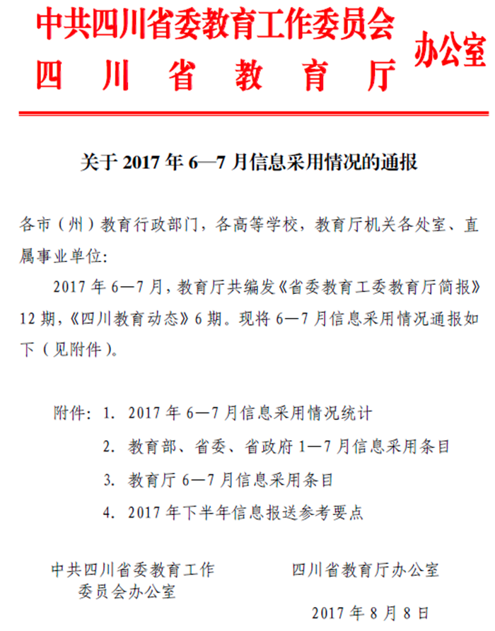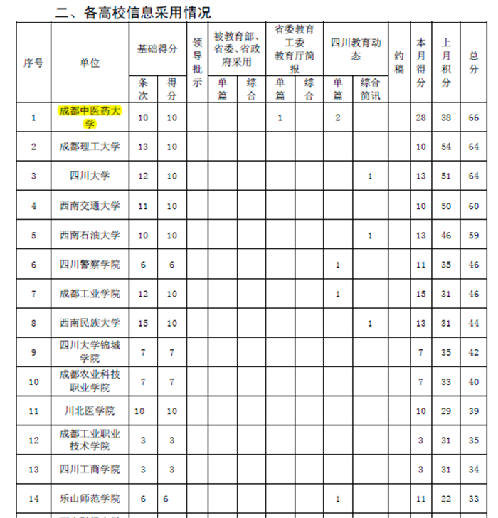省教育厅办公室:对成都中医药大学的信息采用位列第一 发布时间:2017-09-02 00:00:00 浏览次数: 次 【字体:小 大】 时间:2017年8月8日 来源:省委教育工委、省教育厅办公室 内容: 关于2017年6—7月信息采用情况的通报 成都中医药大学在2017 年6—7月,教育厅编发的《省委教育工委教育厅简报》、《四川教育动态》6期中,信息采用位列第一。 (供稿部门:党政办公室 编辑/王其奇) 【打印正文】 上一条:《中国教育报》:中医药发展搭乘“互联网+”快车道 下一条:《成都日报》:骑着“小绿车”去上课 低碳环保引领校园新风尚