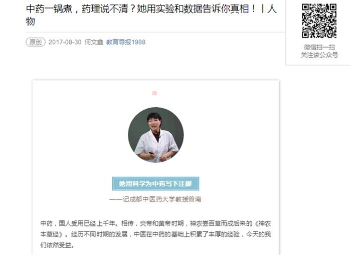 在行业内部,对中药成分和效用的分析被称为中药药理学。成都中医药大学教授曾南就专攻中药药理学。从硕士毕业留校,读博士,到日本留学,到回国后做科研、上课和带学生,曾南一直在成都中医药大学做药理学研究。