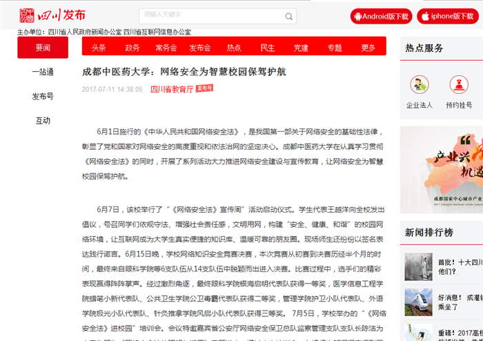6月1日施行的《中华人民共和国网络安全法》,是我国第一部关于网络安全的基础性法律,彰显了党和国家对网络安全的高度重视和依法治网的坚定决心。成都中医药大学在认真学习贯彻《网络安全法》的同时,开展了系列活动大力推进网络安全建设与宣传教育,让网络安全为智慧校园保驾护航。