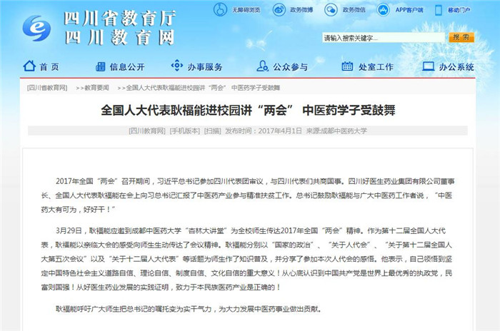 3月29日,耿褔能应邀到成都中医药大学“杏林大讲堂”为全校师生传达2017年全国“两会”精神。作为第十二届全国人大代表,耿福能以亲临大会的感受向师生生动传达了会议精神。耿褔能分别以“国家的政治”、“关于人代会”、“关于第十二届全国人大第五次会议”以及“关于十二届人大代表”等话题为师生作了知识普及,并分享了参加本次人代会的感悟。他表示,自己领悟到坚定中国特色社会主义道路自信、理论自信、制度自信、文化自信的重大意义!从心底认识到中国共产党是世界上最优秀的执政党,民富则国强!从好医生药业发展的实践证明,致力于本民族医药产业是正确的!