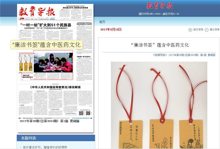 本报讯(王其奇凌宗士摄影报道)在成都中医药大学的校园内,由学生创意自制具有中医药文化元素的“廉洁书签”给党建工作增添了新的亮色。