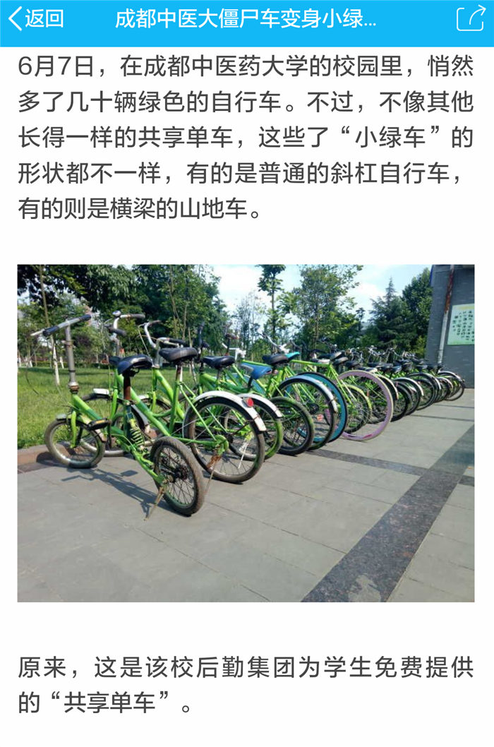 6月7日,在成都中医药大学的校园里,悄然多了几十辆绿色的自行车。不过,不像其他长得一样的共享单车,这些了“小绿车”的形状都不一样,有的是普通的斜杠自行车,有的则是横梁的山地车。