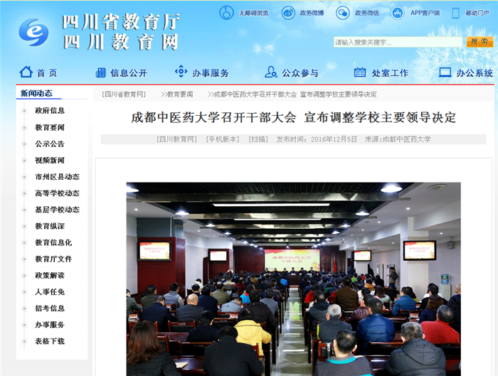 12月1日,成都中医药大学召开干部大会,宣布省委、省政府关于学校主要领导调整的决定。副省长杨兴平,省委组织部副部长蒋天宝,省委教育工委书记、教育厅厅长朱世宏出席会议。