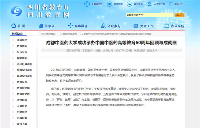 2016年12月29日,由教育部、国家卫生计生委、国家中医药管理局主办、成都中医药大学承办的中华人民共和国中医药高等教育60周年回顾与成就展在北京人民大会堂展出,受到了各级领导和全国各高等中医药院校专家、教学名师高度评价。