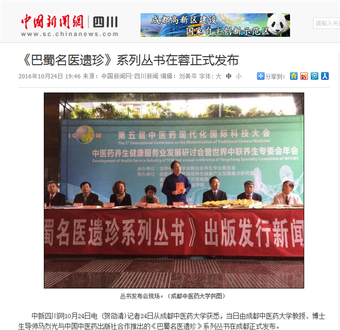 中新四川网10月24日电 (贺劭清)记者24日从成都中医药大学获悉,当日由成都中医药大学教授、博士生导师马烈光与中国中医药出版社合作推出的《巴蜀名医遗珍》系列丛书在成都正式发布。