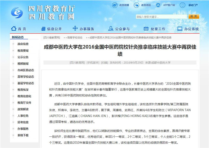 成都中医药大学在2016全国中医药院校针灸推拿临床技能大赛中再获佳绩