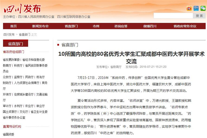 7月15-17日,2016年“系统中药,传承创新”全国优秀大学生夏令营在成都中医药大学举行,来自上海中医药大学、湖北中医药大学、福建农林大学、成都中医药大学等10所国内高校的80名优秀大学生汇聚该校,开展为期三天的学术交流活动。