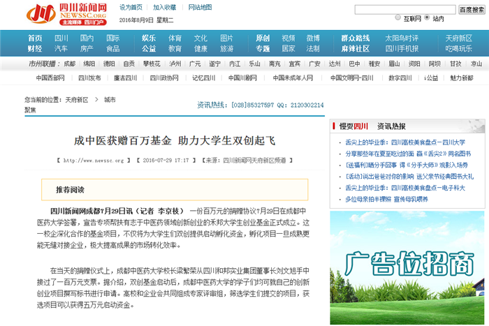 “学校的长项是科研,企业的长处是市场,双方一起来为大学生的双创项目把关,可以让学生的项目更具有可操作性。”成都中医药大学对外合作处处长陈学先介绍,禾邦基金将主要针对大学生在中医新药、器械研发以及市场化探索等方面进行帮扶,除了提供启动资金,也将在孵化过程进行指导,“更重要的是项目一旦相对成熟,企业就会第一时间介入,让成果以最大的效率转化成市场价值。”