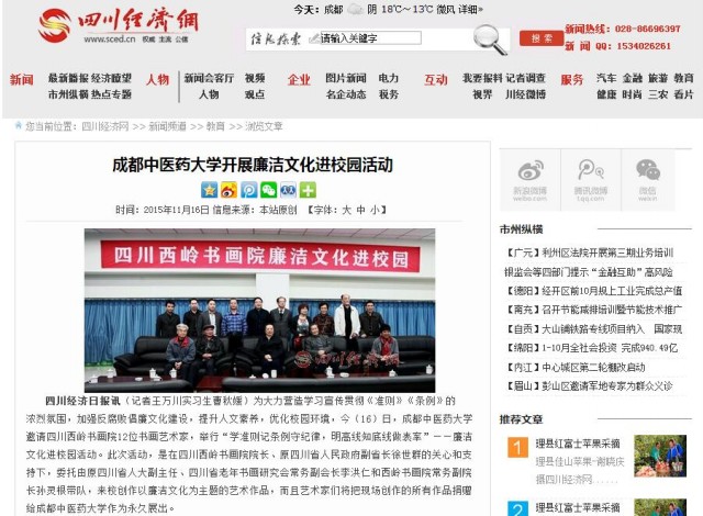 四川经济日报讯(记者王万川实习生曹秋媛)为大力营造学习宣传贯彻《准则》《条例》的浓烈氛围,加强反腐败倡廉文化建设,提升人文素养,优化校园环境,今(16)日,成都中医药大学邀请四川西岭书画院12位书画艺术家,举行“学准则记条例守纪律,明高线知底线做表率”——廉洁文化进校园活动。此次活动,是在四川西岭书画院院长、原四川省人民政府副省长徐世群的关心和支持下,委托由原四川省人大副主任、四川省老年书画研究会常务副会长李洪仁和西岭书画院常务副院长孙灵根带队,来校创作以廉洁文化为主题的艺术作品,而且艺术家们将把现场创作的所有作品捐赠给成都中医药大学作为永久展出。