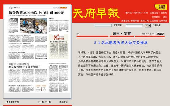 早报讯 (记者 王亚楠实习生 黄睿)昨日,成都中医药大学开展了关爱老人中医康复行动。当天9:00,51名志愿者来到学府社区老年人活动中心,为许多肢体有疾病的老年人和残疾人,认真评估其肢体功能后,并在专业人员的指导下使用艾灸、拔罐、推拿等中医手法为其缓解症状。为该项目顺利开展,校青年志愿者协会成立了基层健康医疗服务队,由专业教师、临床研究生、在校医护各专业学生组成。