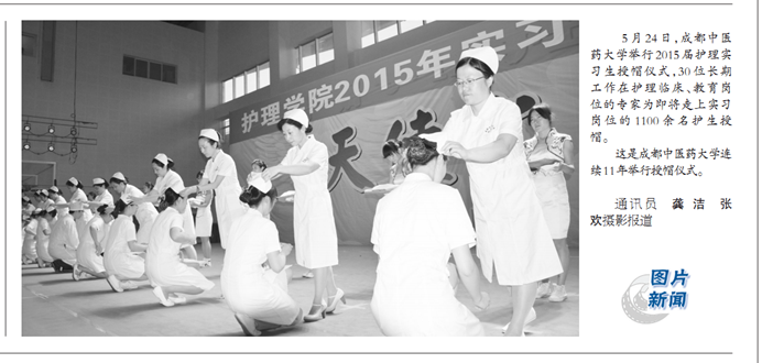 《中国中医药报》 :成都中医药大学举行2015年护理实习生授帽仪式 发布时间:2015-05-28 00:00:00 浏览次数: 次 【字体:小 大】 时间:2015年5月28日 来源:《中国中医药报》 链接:http://www.cntcmvideo.com/zgzyyb/html/2015-05/28/node_3.htm 内容: 【图片新闻】 5月24日, 成都中医药大学举行2015届护理实习生授帽仪式, 30位长期工作在护理临床、 教育岗位的专家为即将走上实习岗位的 1100 余名护生授帽。这是成都中医药大学连续11年举行授帽仪式。 通讯员 龚 洁 张欢摄影报道 【打印正文】 上一条:《科技日报》:中医养生有望迎来更多发展机遇 下一条:《中国中医药报》:怀念郭子光专版