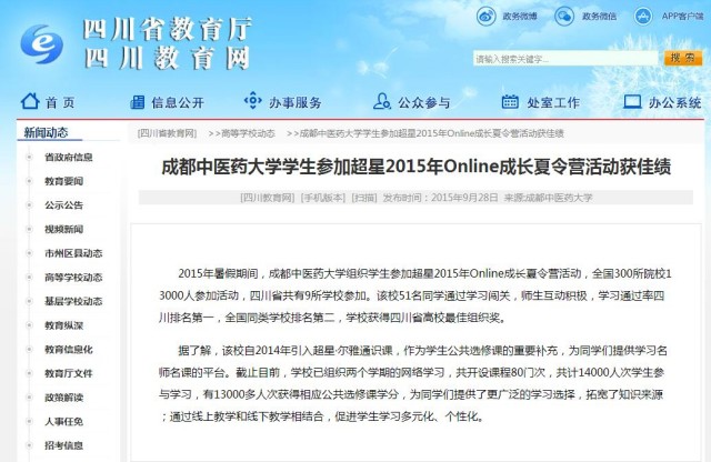 2015年暑假期间,成都中医药大学组织学生参加超星2015年Online成长夏令营活动,全国300所院校13000人参加活动,四川省共有9所学校参加。该校51名同学通过学习闯关,师生互动积极,学习通过率四川排名第一,全国同类学校排名第二,学校获得四川省高校最佳组织奖。