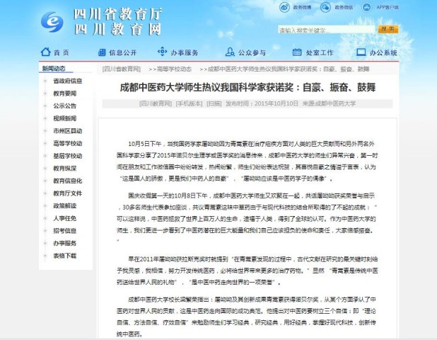 10月5日下午,当我国药学家屠呦呦因为青蒿素在治疗疟疾方面对人类的巨大贡献而和另外两名外国科学家分享了2015年诺贝尔生理学或医学奖的消息传来,成都中医药大学的师生们异常兴奋,第一时间在朋友和工作微信圈中纷纷转发,热闹纷繁,师生们纷纷表达祝贺,其喜悦自豪之情溢于言表,认为“这是国人的骄傲,更是我们中药人的自豪”,“屠呦呦应该是中医药学子的偶像”。