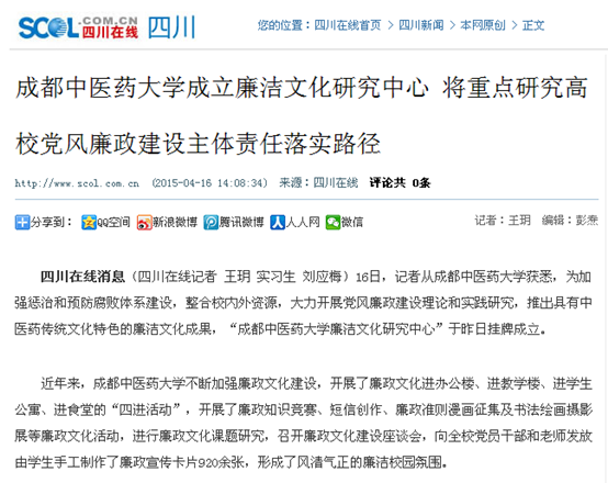 成都中医药大学成立廉洁文化研究中心 将重点研究高校党风廉政建设主体责任落实路径