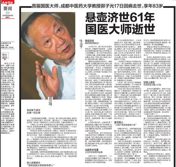 首届国医大师、成都中医药大学教授郭子光17日因病去世,享年83岁