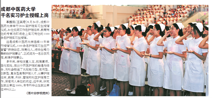 本报讯 (王其奇) 5月24日, 成都中医药大学举行2016届护理实习生授帽仪式, 30位长期工作在护理临床、 教育岗位的专家为即将走上实习岗位的1100余名护理实习生授帽。