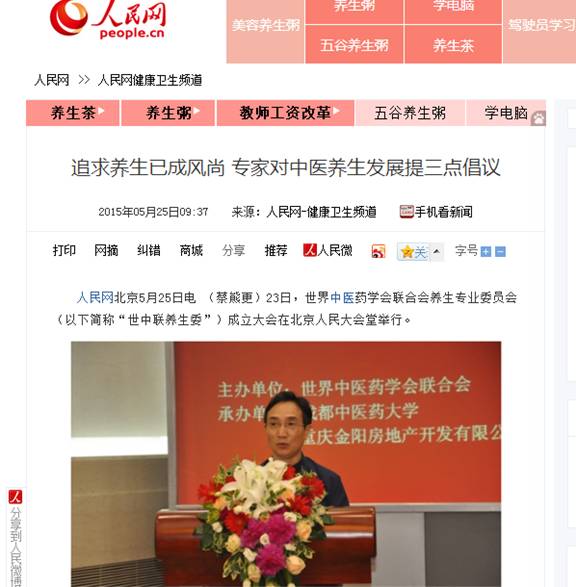 人民网北京5月25日电 (蔡熊更)23日,世界中医药学会联合会养生专业委员会(以下简称“世中联养生委”)成立大会在北京人民大会堂举行。