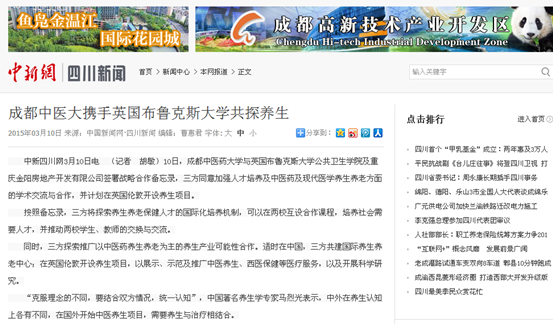 中新四川网3月10日电 (记者 胡敏)10日,成都中医药大学与英国布鲁克斯大学公共卫生学院及重庆金阳房地产开发有限公司签署战略合作备忘录,三方同意加强人才培养及中医药及现代医学养生养老方面的学术交流与合作,并计划在英国伦敦开设养生项目。