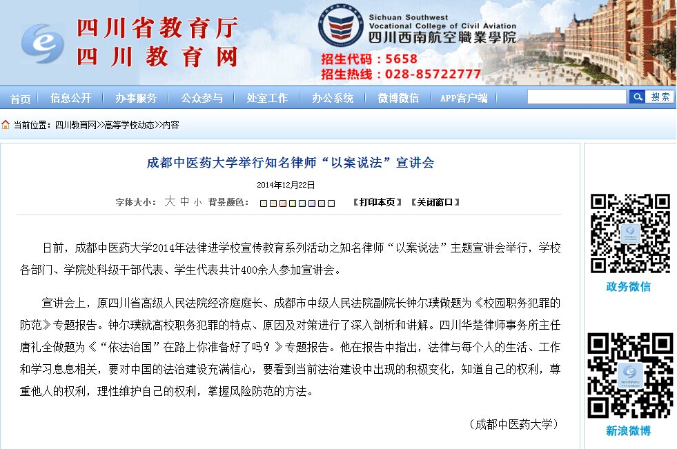 成都中医药大学举行知名律师“以案说法”宣讲会