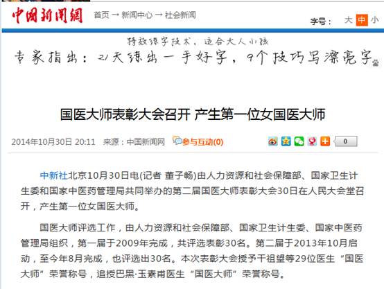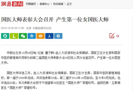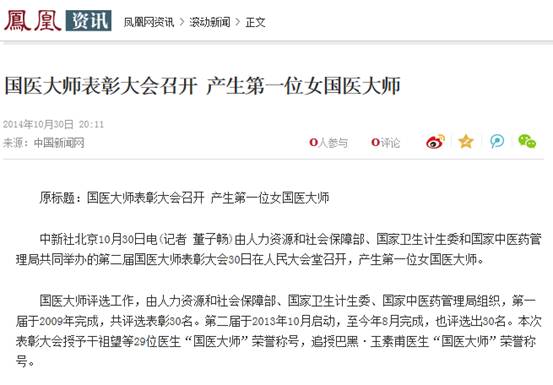 中新社北京10月30日电(记者 董子畅)由人力资源和社会保障部、国家卫生计生委和国家中医药管理局共同举办的第二届国医大师表彰大会30日在人民大会堂召开,产生第一位女国医大师。