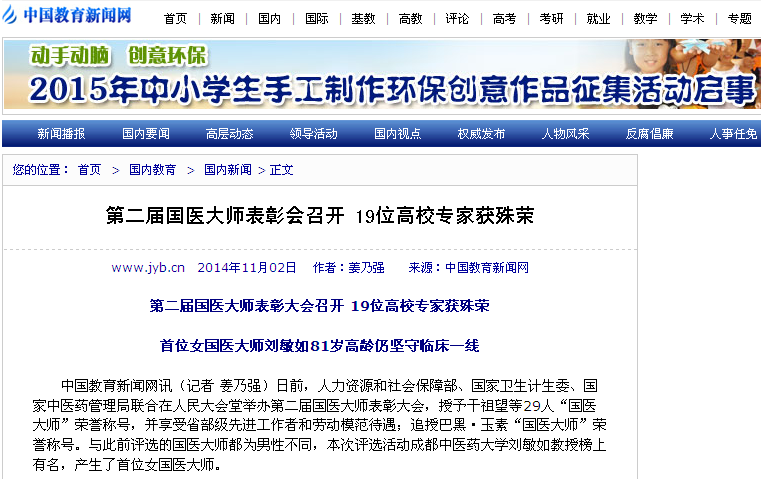 中国教育新闻网讯(记者 姜乃强)日前,人力资源和社会保障部、国家卫生计生委、国家中医药管理局联合在人民大会堂举办第二届国医大师表彰大会,授予干祖望等29人“国医大师”荣誉称号,并享受省部级先进工作者和劳动模范待遇;追授巴黑·玉素“国医大师”荣誉称号。与此前评选的国医大师都为男性不同,本次评选活动成都中医药大学刘敏如教授榜上有名,产生了首位女国医大师。