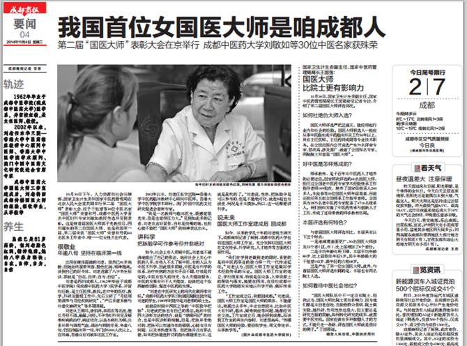“工作室成立后,我要回成都。”刘老说,国医大师工作室是国医大师的载体,不能虚设。被派出去多年,中途也曾回来,比如中医大有科研、临床、疑难病症等问题,她都经常在交流。工作室成立后,她会回到成都。而谈到工作室的具体内容时,刘老很高兴,“传播国医大师的经验,要招收学生,师父带徒弟,从事教学等。”