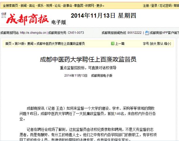 成都商报讯(记者 王垚)如何来监督一个大学的建设、学术、采购等等领域的腐败问题?昨日,成都中医药大学聘任了一大批廉政监督员,首批146名,来自校内外各行各业。