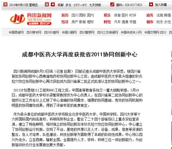 四川新闻网成都6月13日讯(记者 赵毅) 日前记者从成都中医药大学获悉,继四川省首批协同创新中心西南道地药材协同创新中心之后,由成都中医药大学牵头组建的针灸经穴效应协同创新中心再次获批成为四川省第二批正式批准认定的协同创新中心之一。
