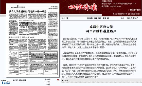 四川经济日报讯 (记者 王万川 ) 近日,记者从成都中医药大学2014年学校党风廉政建设工作会议获悉,该校首批十名特邀监察员正式诞生。据悉,监察员是该校在创新党风廉政建设工作机制方面的尝试,最终将建立起一个百人规模的监察员库,人员构成包括纪检专干、师生代表、党外人士及社会专家等各个层面。