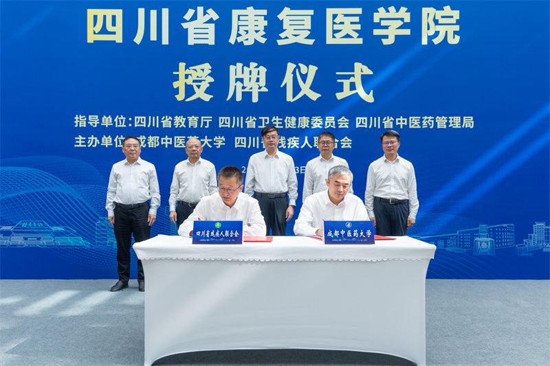在与会领导的共同见证下,冯全生与黄卫德分别代表成都中医药大学、四川省残疾人联合会签署共建四川省康复医学院合作协议。
